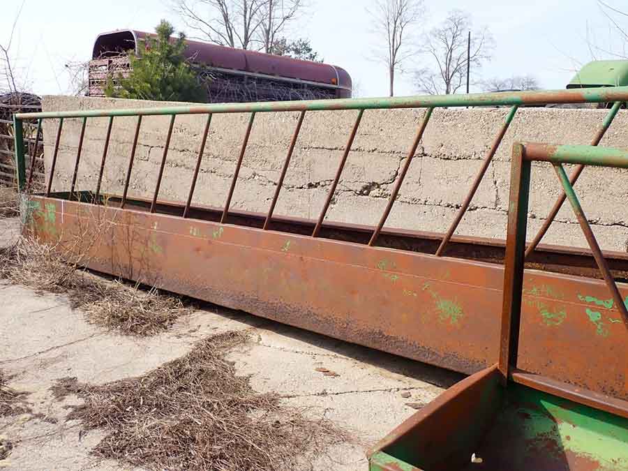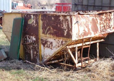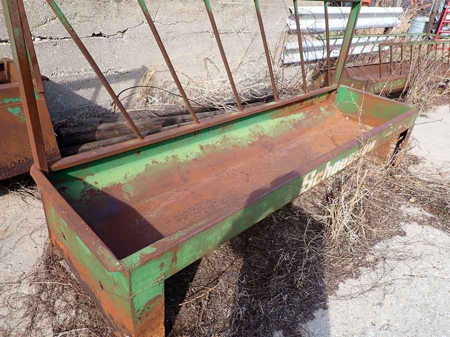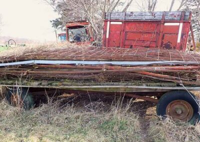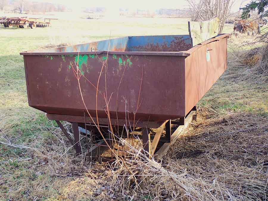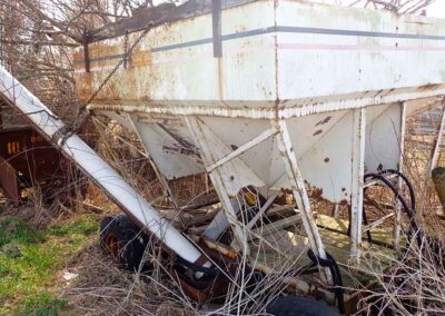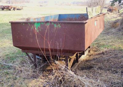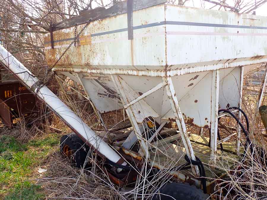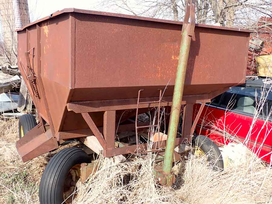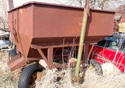WAGONS: Grainovator wagon w/auger; fertilizer auger wagon; running gear; gravity box-sells with scrap in it; Rex chopper box; red running gear; 3-Schoessow fenceline grain feeders, 2-10’ & 1-20’; gravity box top; 8 or 10-ton running gear; gravity wagon on JD gear;