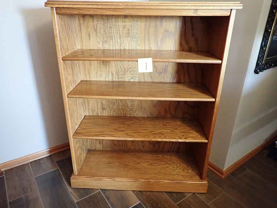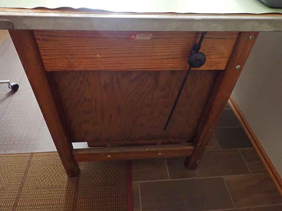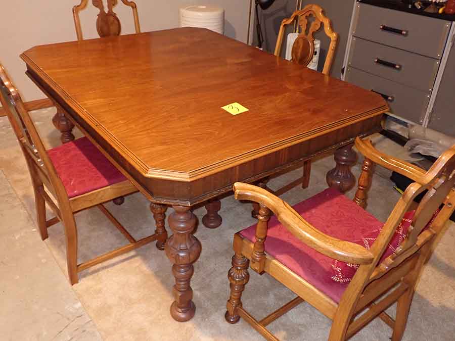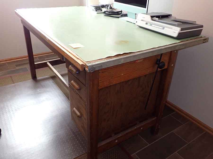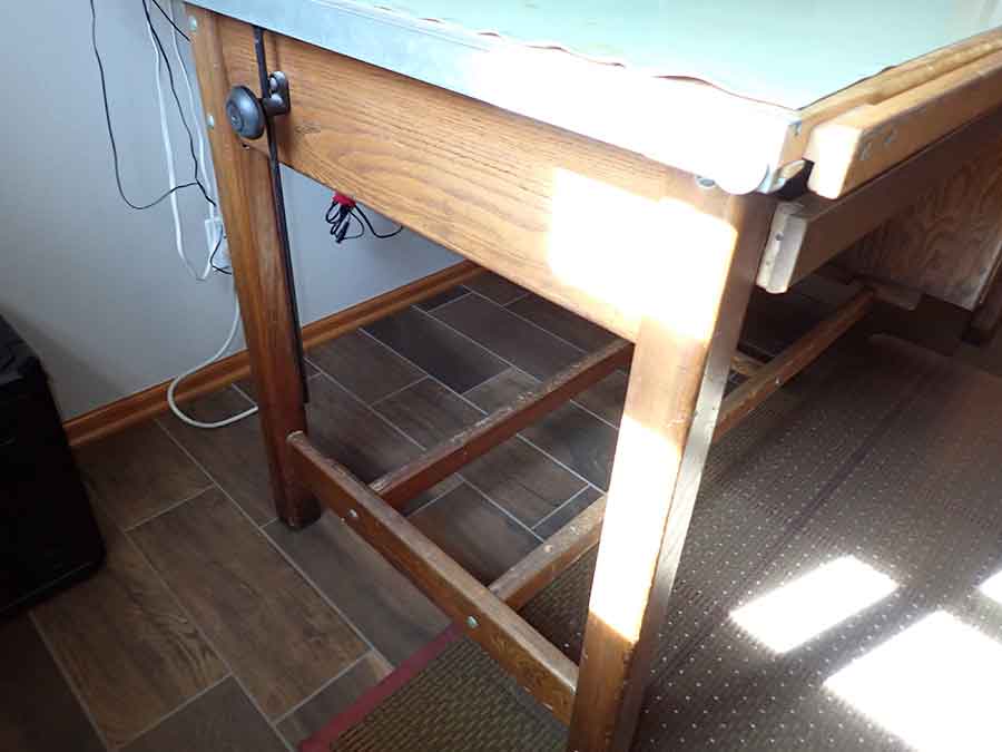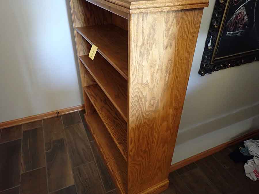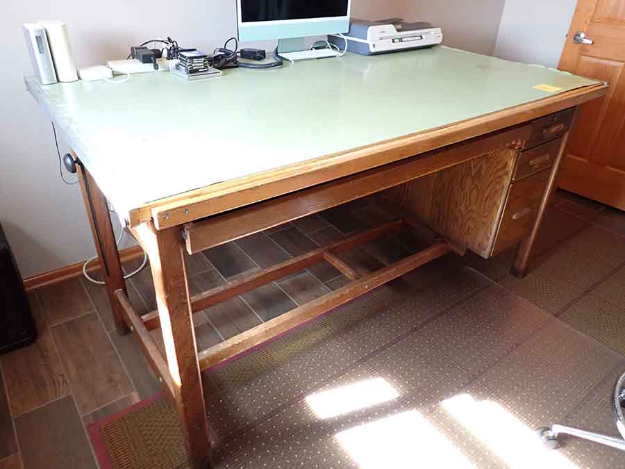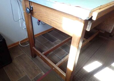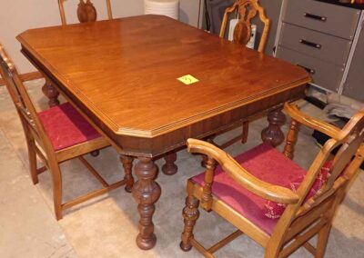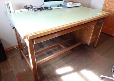 FURNITURE: Amish made oak book shelf w/3 shelves, 38”Wx42”Hx1’D; 1920’s Armoire w/original mirror inside, 4’Wx6½‘x18”D, nice condition; 1800’s dining table w/4 chairs, with the leaves makes a 7½’ table, 4’10”x3’8” w/out leaves; drafting table w/chair (padding can be removed), 4-drawers, 6’Wx2’Hx3’D top tips up and can be removed from base for easier moving;
