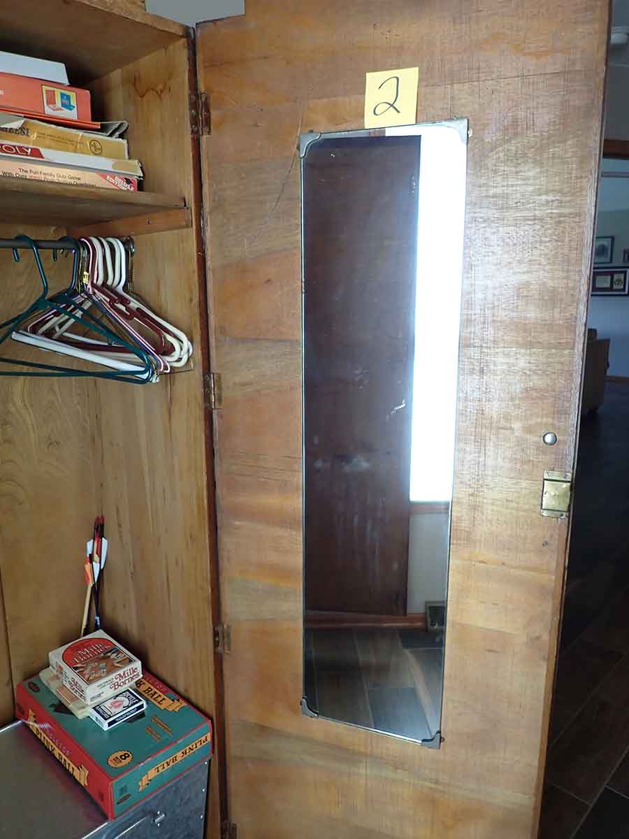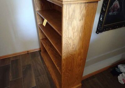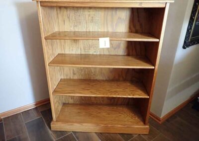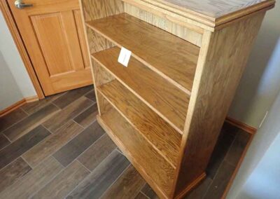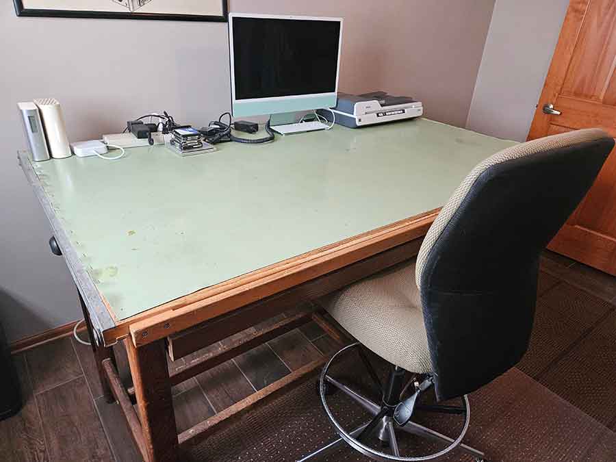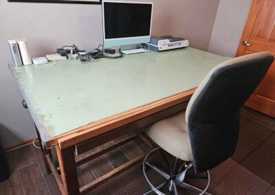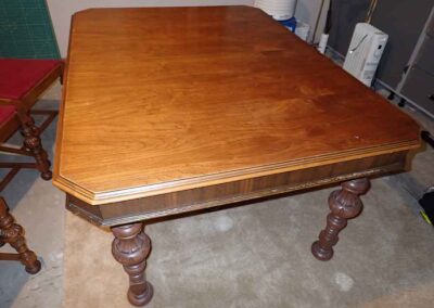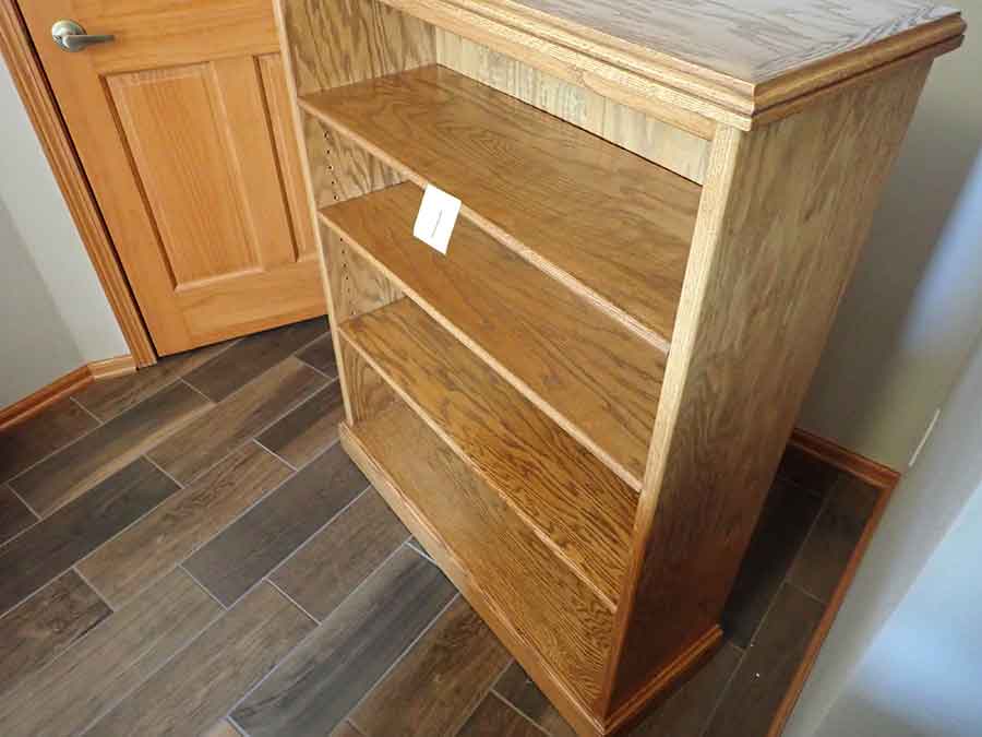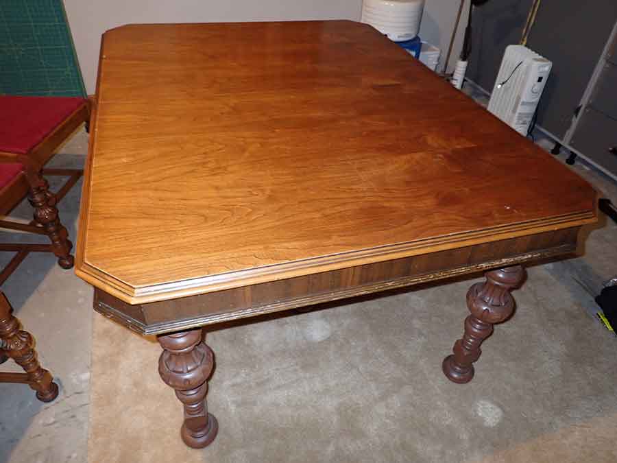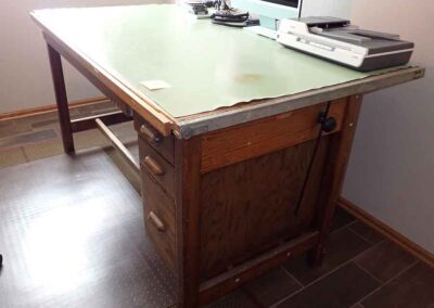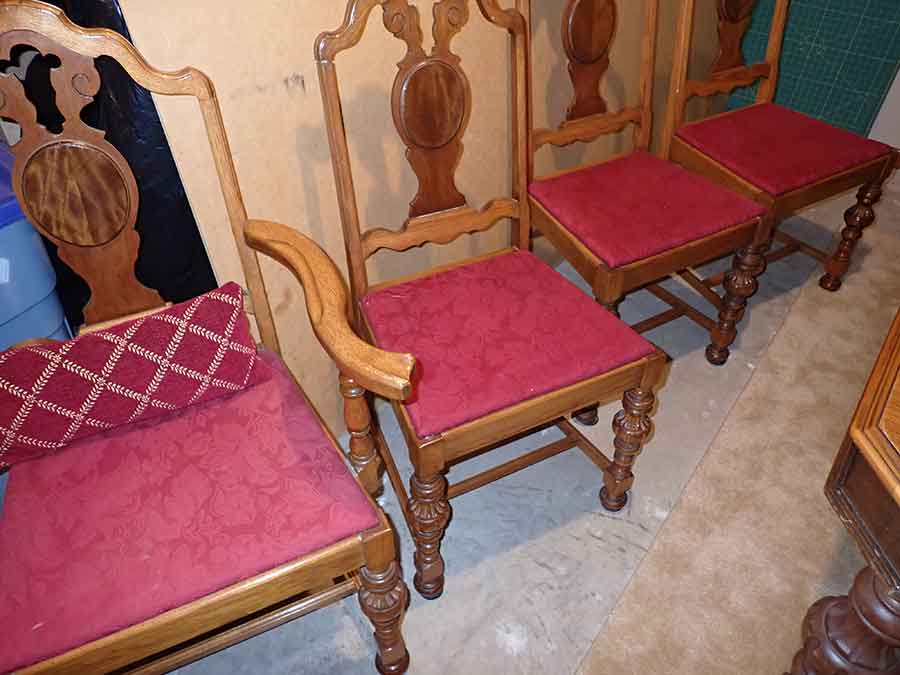 FURNITURE: Amish made oak book shelf w/3 shelves, 38”Wx42”Hx1’D; 1920’s Armoire w/original mirror inside, 4’Wx6½‘x18”D, nice condition; 1800’s dining table w/4 chairs, with the leaves makes a 7½’ table, 4’10”x3’8” w/out leaves; drafting table w/chair (padding can be removed), 4-drawers, 6’Wx2’Hx3’D top tips up and can be removed from base for easier moving;
