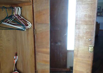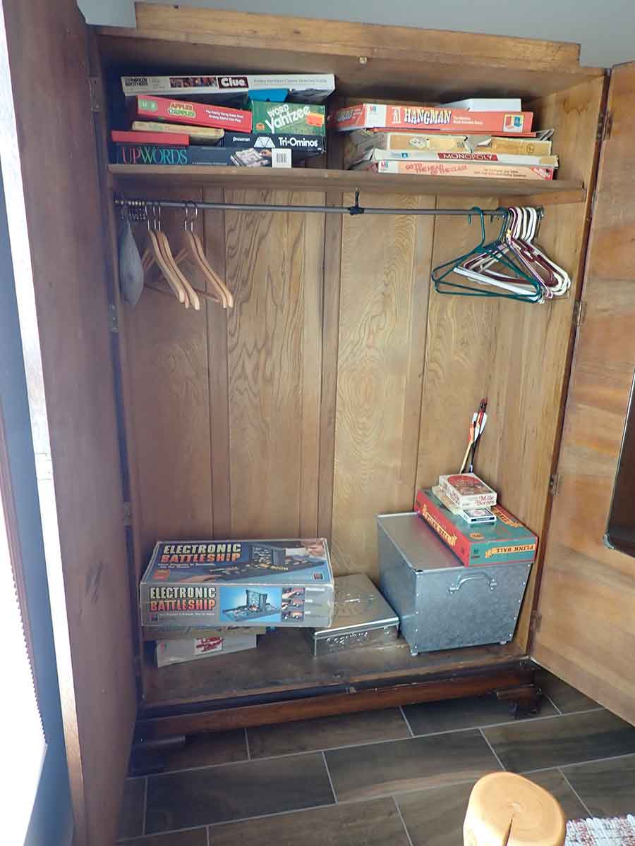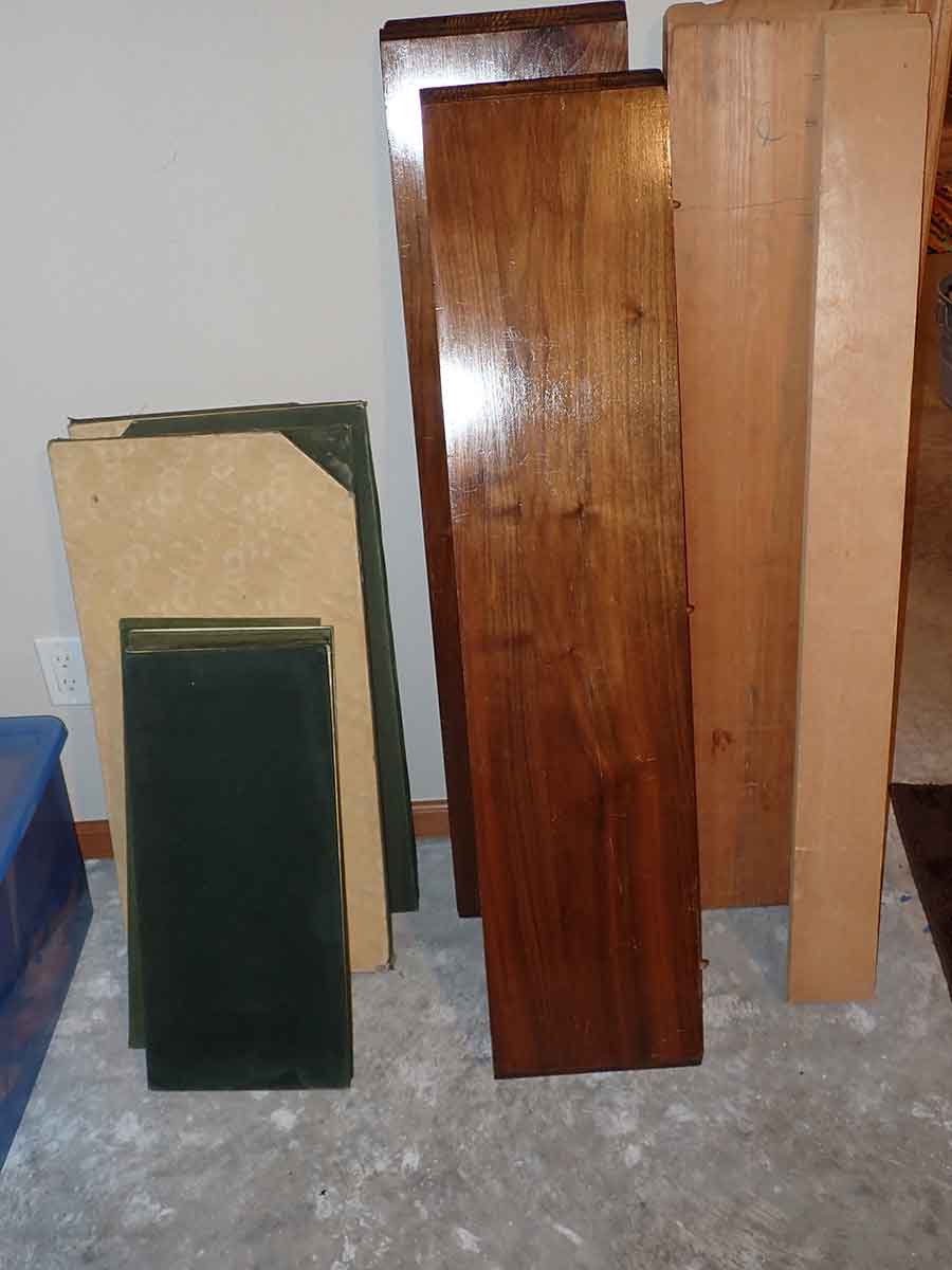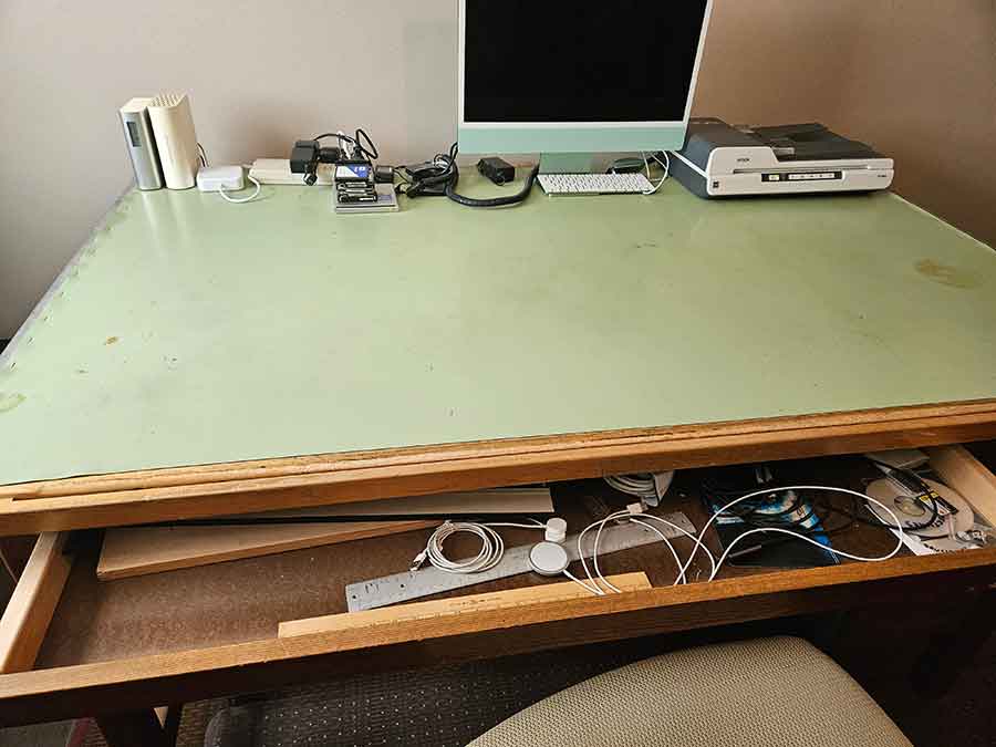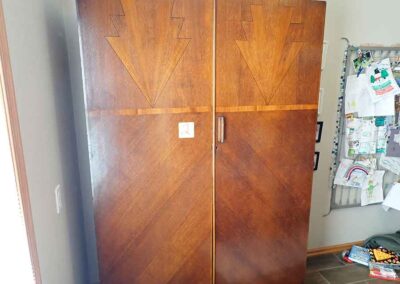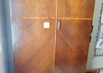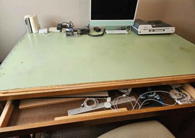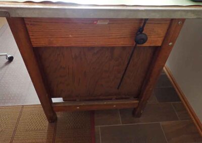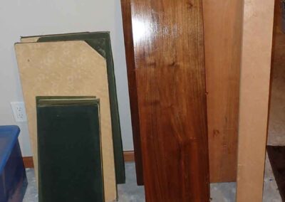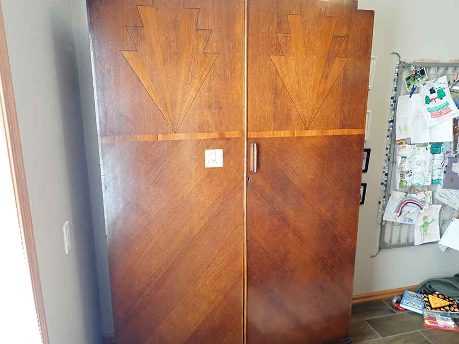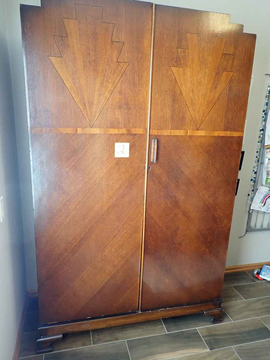 FURNITURE: Amish made oak book shelf w/3 shelves, 38”Wx42”Hx1’D; 1920’s Armoire w/original mirror inside, 4’Wx6½‘x18”D, nice condition; 1800’s dining table w/4 chairs, with the leaves makes a 7½’ table, 4’10”x3’8” w/out leaves; drafting table w/chair (padding can be removed), 4-drawers, 6’Wx2’Hx3’D top tips up and can be removed from base for easier moving;