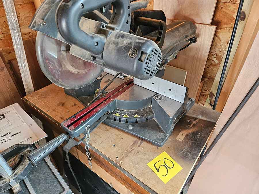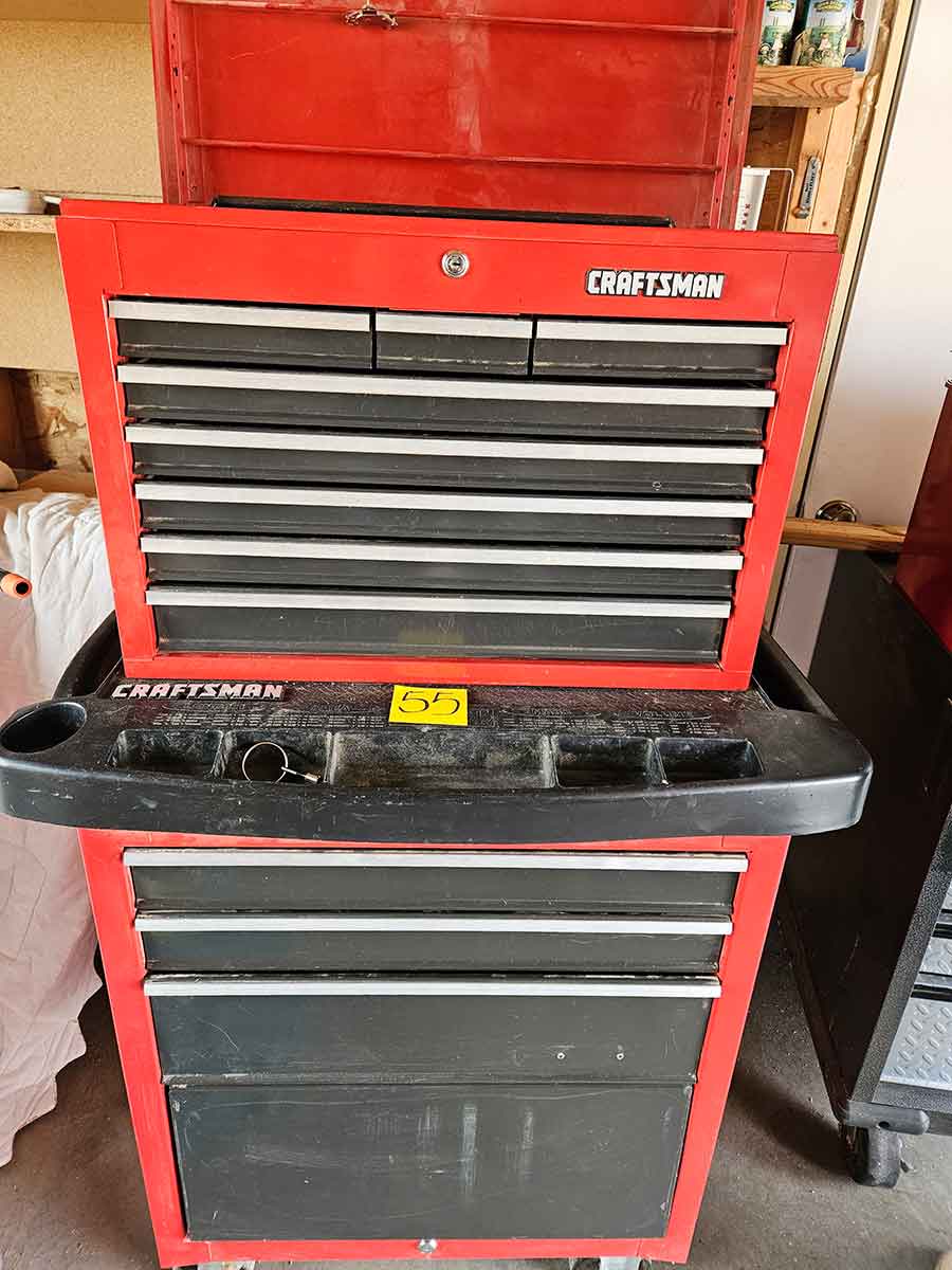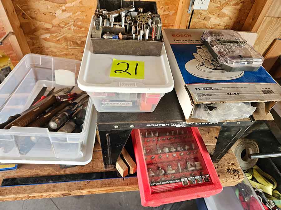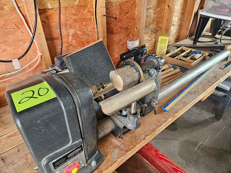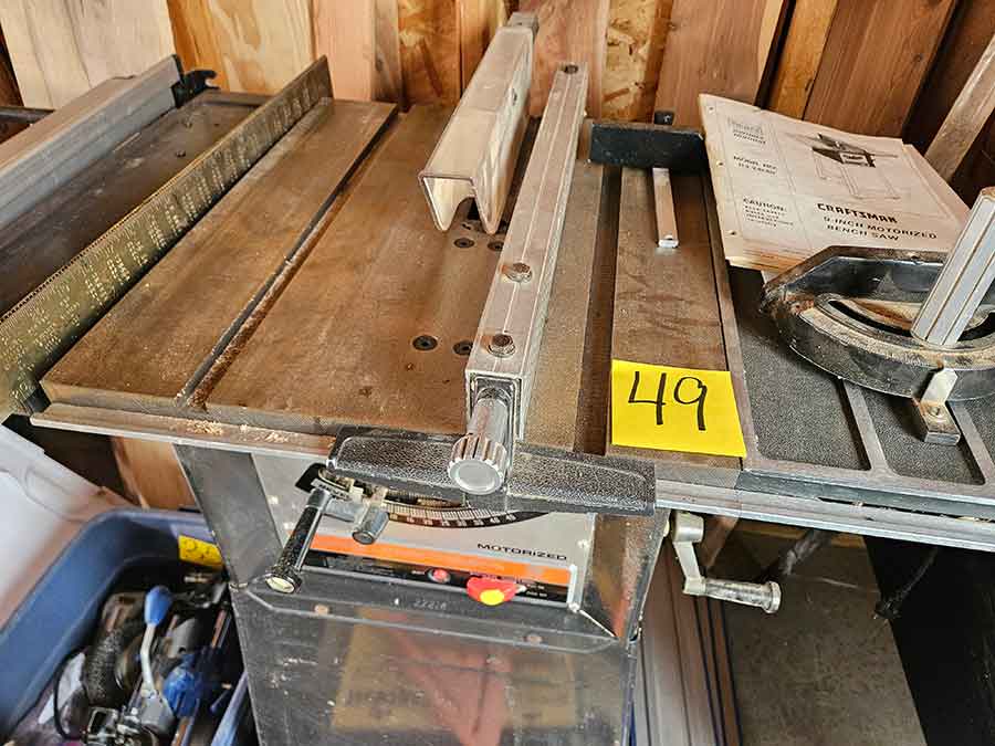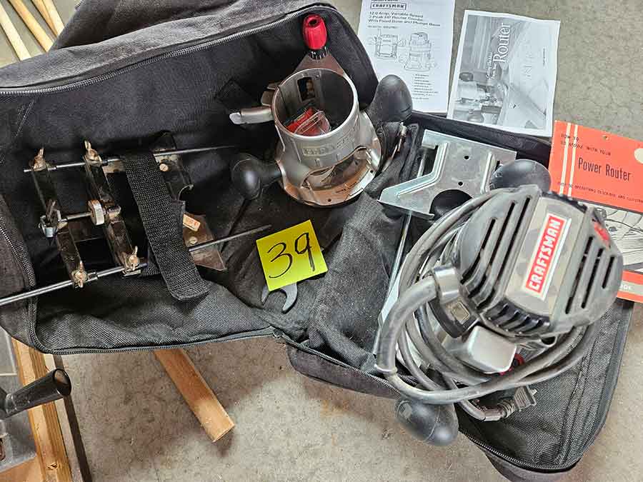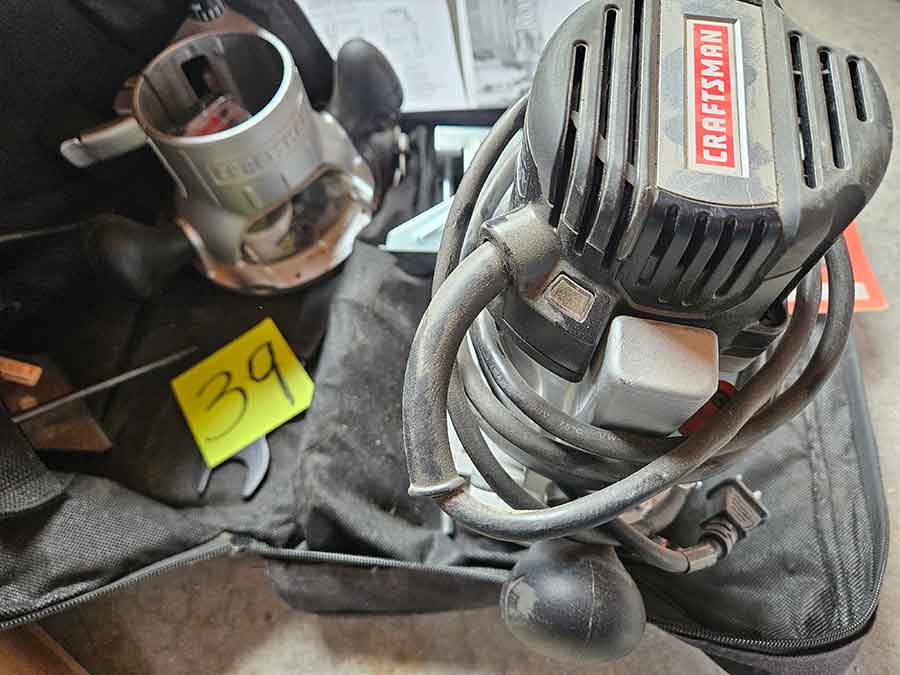 TOOL & SHOP ITEMS: Craftsman stackable tool chest on wheels, 8-drawers on top, 3-drawers & cabinet on bottom, nice; Craftsman 18 ga. comb. nailer/stapler; Craftsman 2½-ton floor jack; Craftsman 18” jig saw w/motor; Craftsman 12” wood lathe, mounted on a 7’x34”x22” work bench w/Skil high speed sander; Craftsman table router; Craftsman files, chisels, & punch; Craftsman hole saw attachments; Craftsman box wrenches, various sizes up to 1”; several Craftsman screwdrivers; Craftsman Router, 12 amp variable spd, 2 peak hp router combo with fixed base & plunge base; Craftsman 9” bench saw w/ex. blades; Craftsman 8½” sliding compound mitre saw on stand; Craftsman woodworking clamps; Makita planer; Dewalt Sawzall in case; Bosch HD plunge router; Bosch router guide w/rotary tool accessories; Schumacher Farm & Ranch battery charger, 12V/200A – 6V/150A, 40V boost 2<>Amp storage charge, like new, very nice; Makita circular saw, 7¼”, 5,007F; jumper cables, like new; Bernz-o-Matic tote torch; Stanley Bostitch stapler; Rigid Drill, 14.4V w/charger & ex. battery; Black & Decker 3/8 air drill; CPI air grinder; 10’ tape measure/level; Ryobi drill bits; 4 pc. Brad Point drilling set; bolt cutter; pvc pipes-app. 6½‘; 24 pc. carbide master set; axe; ½” pipe bender; crowbar; sledgehammer; Danby Dehumidifier; Easy Lite Type III 10’ alum. step ladder; Werner 24’ alum. ext. ladder; misc. hand tools; rivet guns; pliers; crimp tool; box cutters; shop stool & light; misc. bits; saws; antique bit brace; 2 & 4ft levels; shop radio; auto ranging multi-meter; caulk strips; transistor tester; various size sockets; breaker bar; 12” crescent wrench; ½” ratchet; Kobalt tap & die set, in case; allen wrenches; tow & ratchet straps; 2-25’ tape measures; 30’ tape measure; Dremel tool & accessories; 2-full lock jaw organizers; elec. cord & outlet; chainsaw attach. w/12” blade; hedge trimmer attach.; Dremel saw max; Makita case-empty; Rigid ShopVac, 5.5hp w/ex. filter; misc. boards & lumber; box full of adj. hand screw clamps; Stihl chainsaw & protective chaps garment;