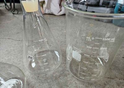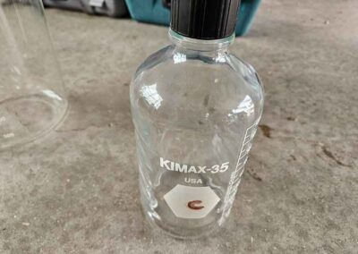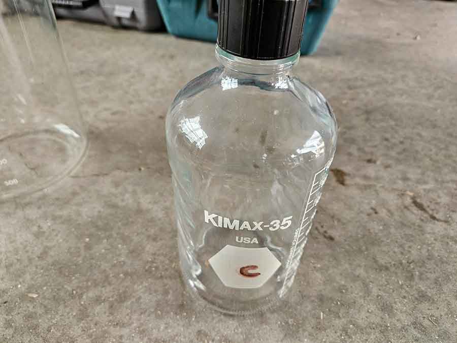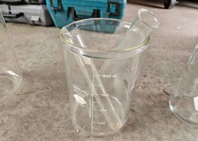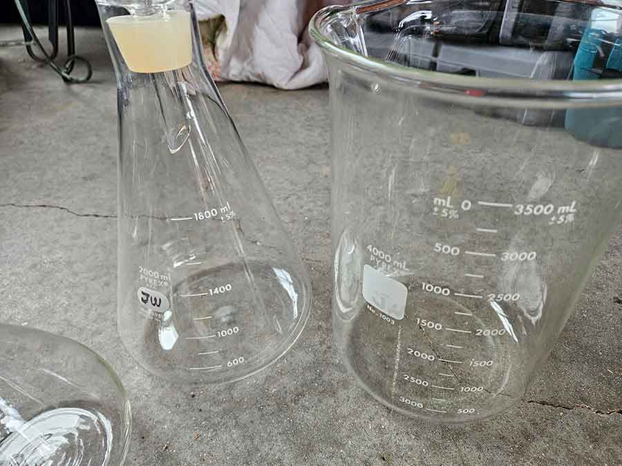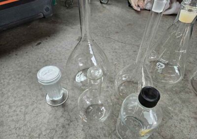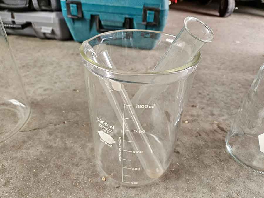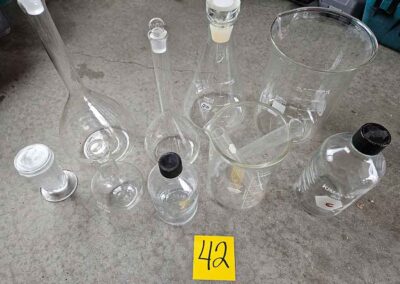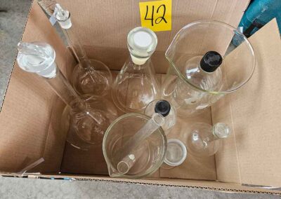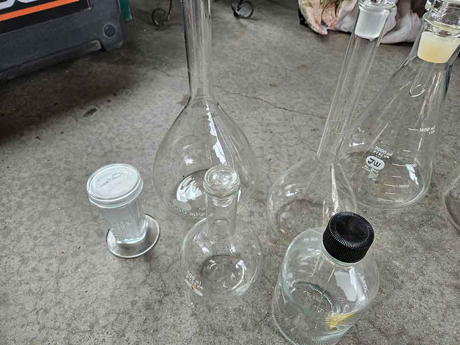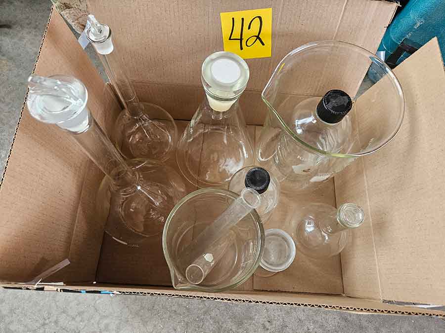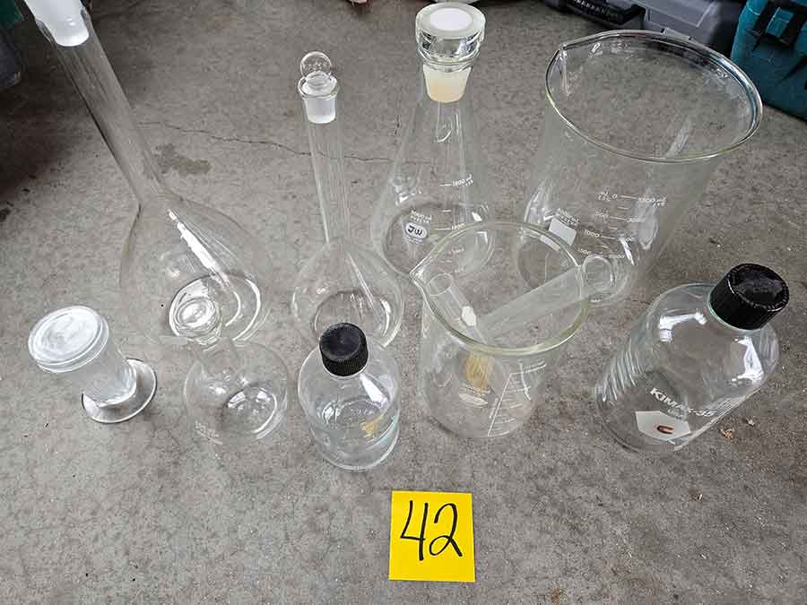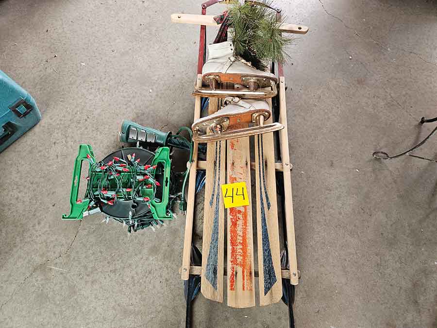MISC.: Pyrex Chemistry Glassware-2-beakers, flasks inc. lab volumetric flask & boiling flask, Coplin staining jar; sm. metal filing cabinets/organizers; vintage sled décor w/ice skates; xmas lights;