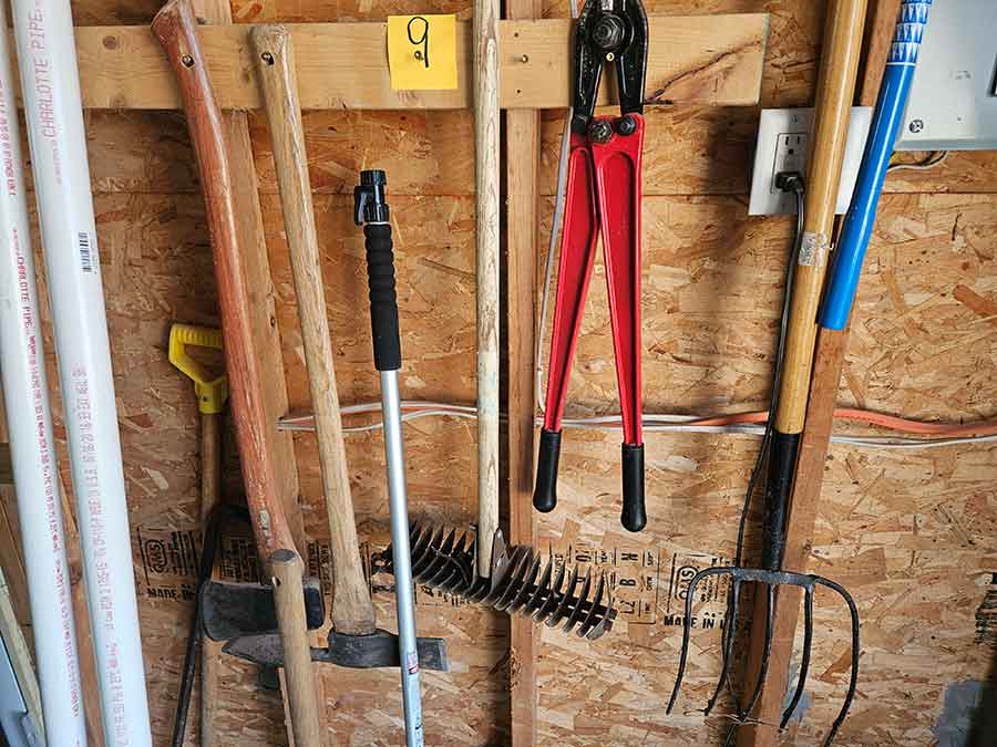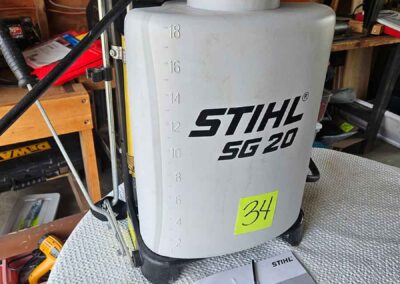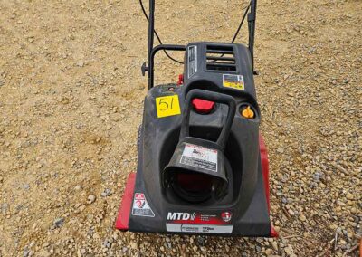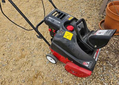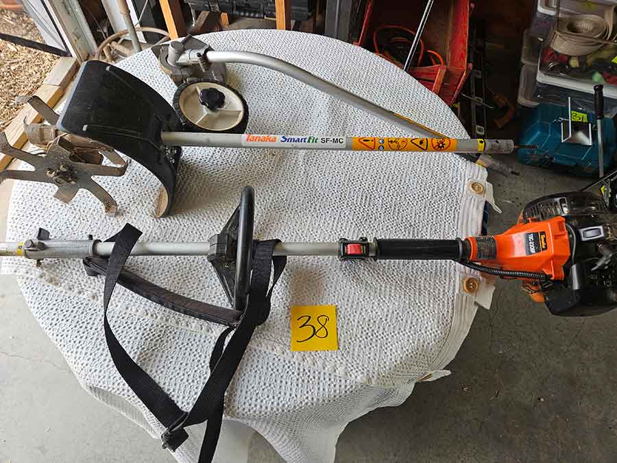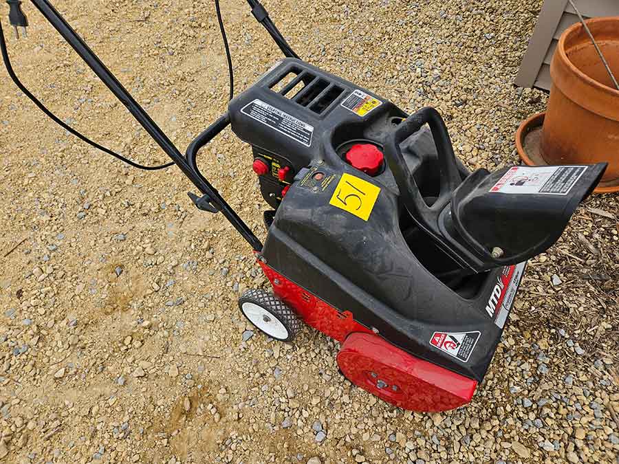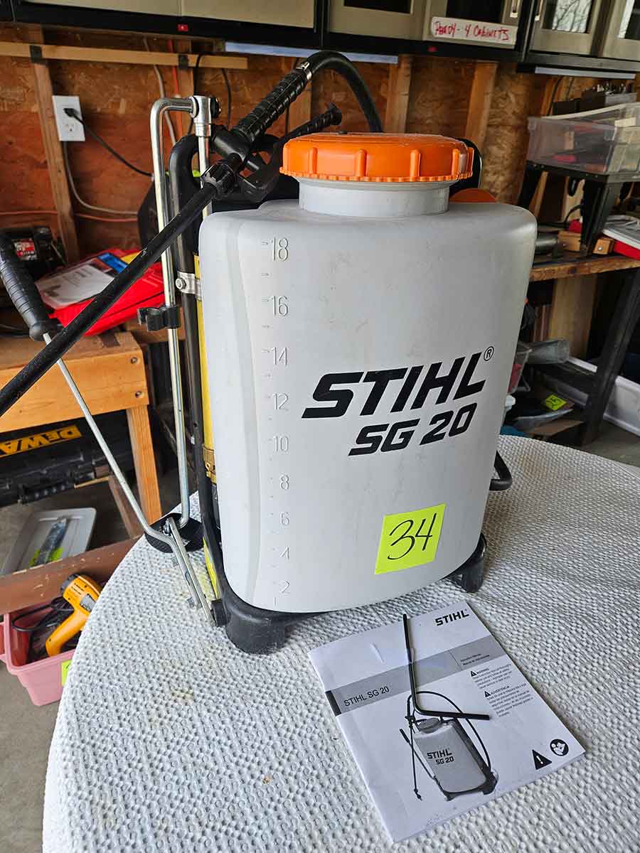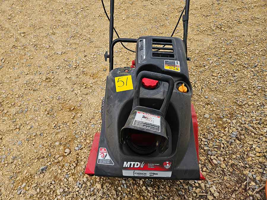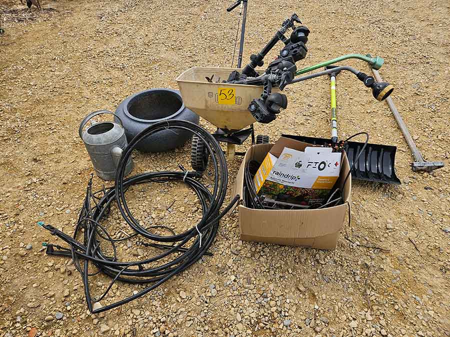 SNOWBLOWER, LAWN & GARDEN: MTD snowblower, 179cc, elec. start, 4-cycle; Stihl SG20 backpack sprayer; Tanaka TBC230SF weed eater w/tiller & edger attach.; port. greenhouse w/4-shelves, 5’Hx28”Wx19”D; 5-tine pitchfork; thatcher rake; post hole digger; cast iron rooster; Radio Flyer Town & Country wagon w/wood sides; John Deere lawn mower belt; 2-wrought iron plant stands, one with glass; 2-shepherds hooks; garden hose sprayer attach.; galv. water can; snow shovels; automatic watering kit;