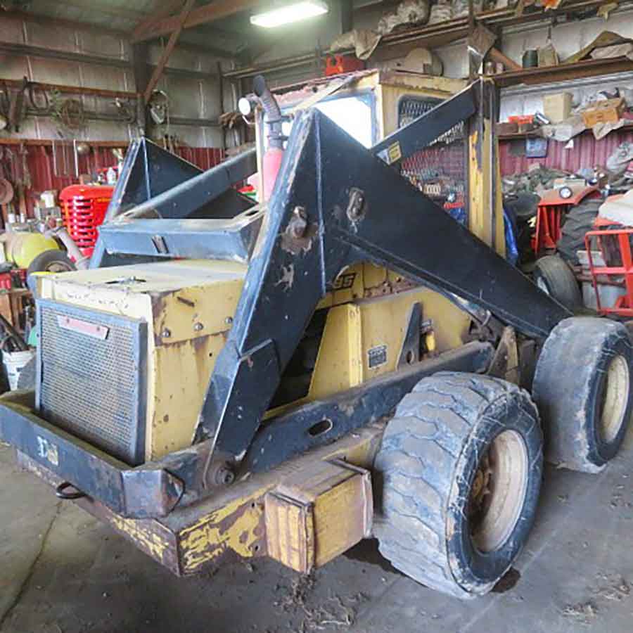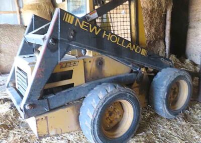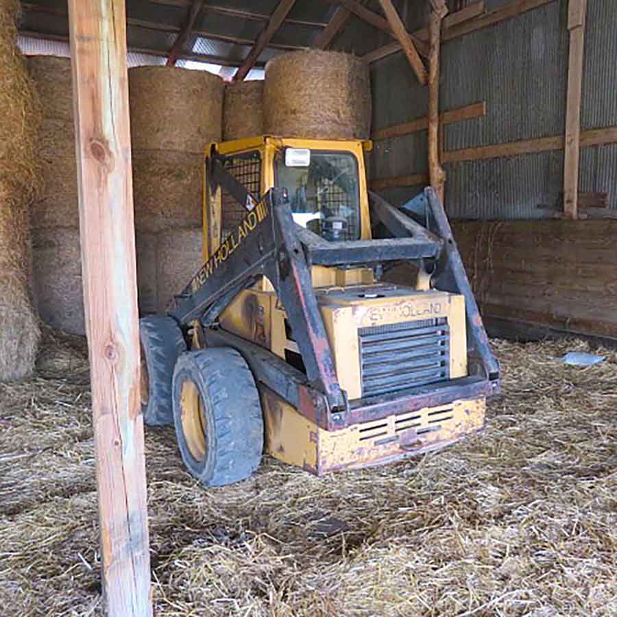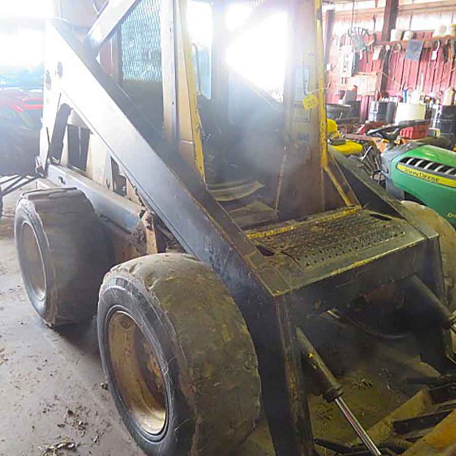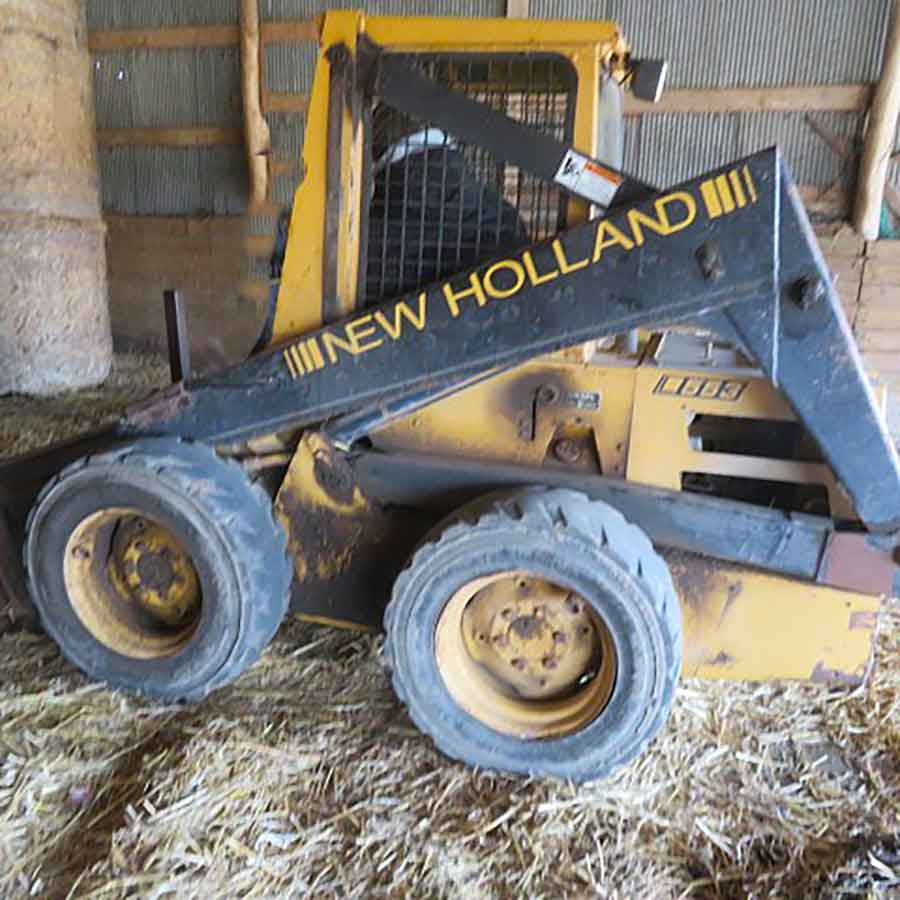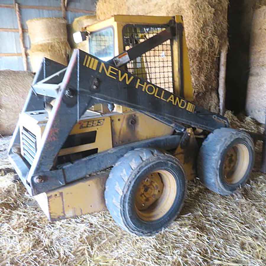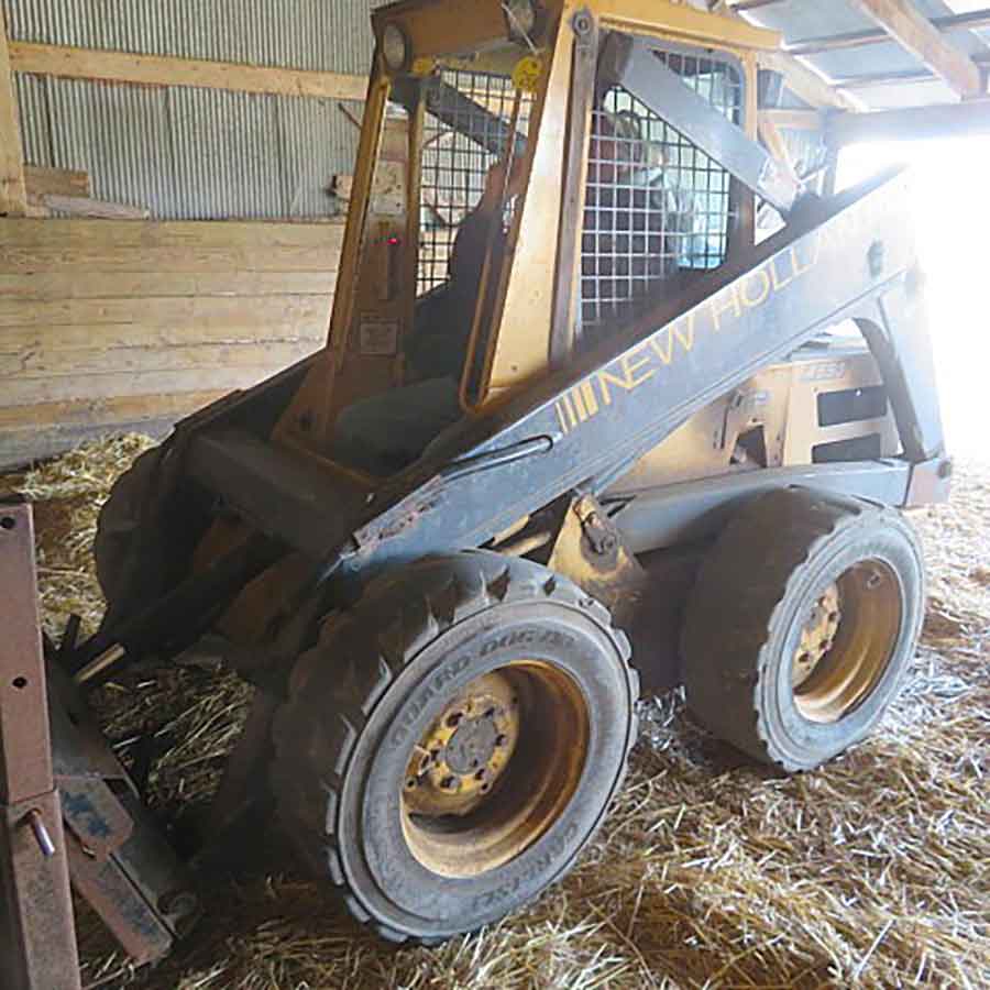 SKIDLOADERS & ATTACHMENTS.: NH L785 w/cage, diesel, tach shows 6745 hrs., rear counterweights; NH L553 w/cage, diesel, tach shows 8448 hrs.; ATTACHMENTS: 2-8’ skidloader ramps; set of skidloader tracks; 2-pallet fork attach.; 2-sets of alum. ramps; 3-tine bale fork;