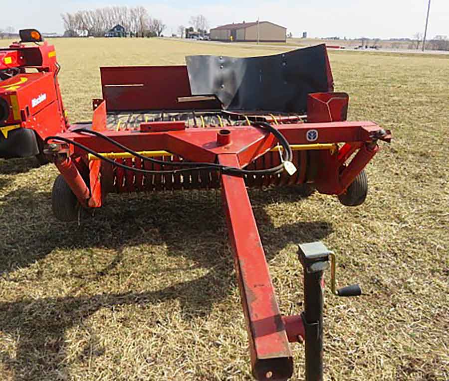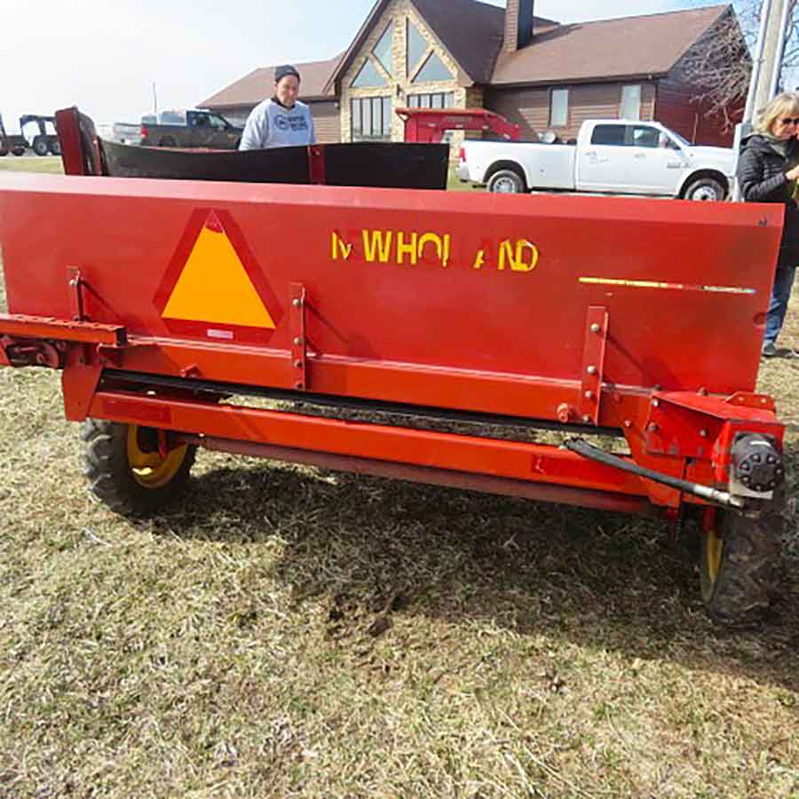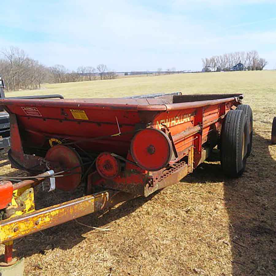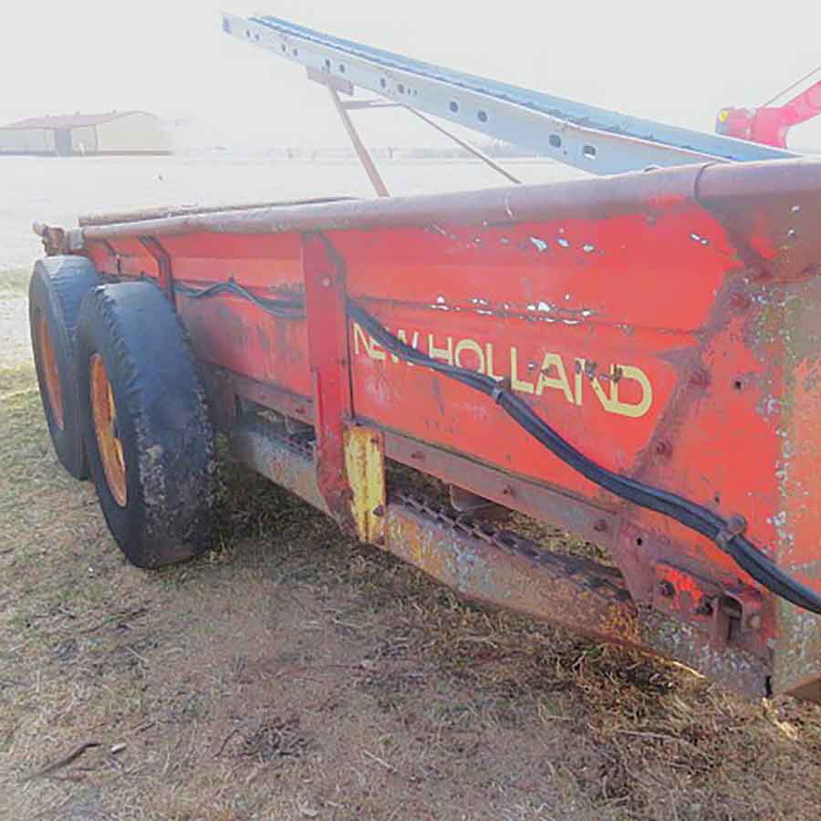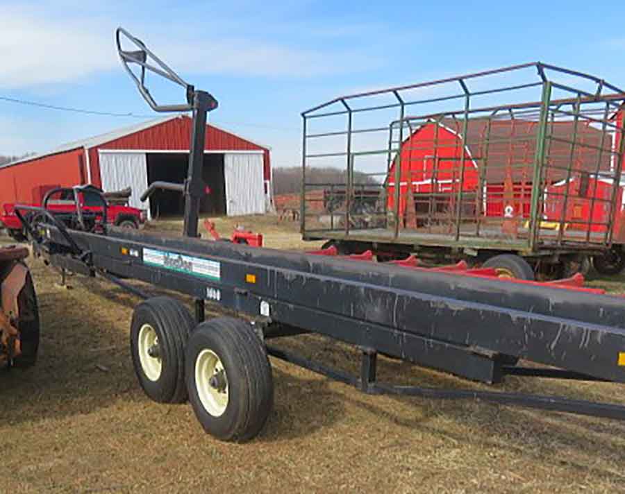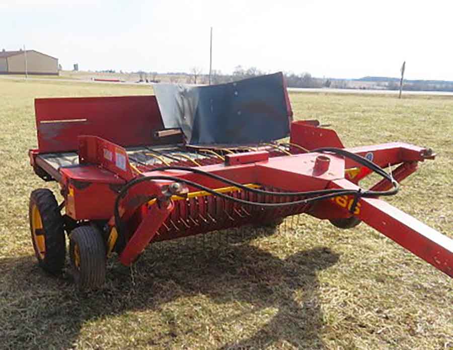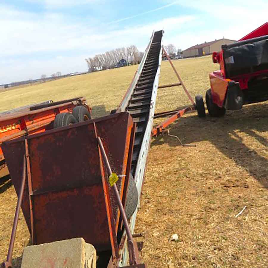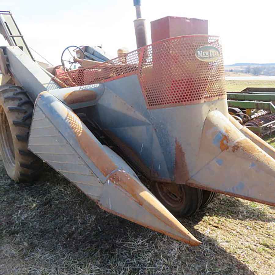 FARM MACHINERY & EQUIP: NH 166 hay invertor, hyd. apron, bought new; New Idea 40’ Elevator, pto, w/bale chute; NH manure spreader, tandem; MacDon 1000 bale accumulator; 6-rd bale carts w/dolly; 40’ single chain elevator w/motor on transit; 50’ SC conveyor w/motor on transit; asst of parts single chain bale conveyors; 500 gal. fuel barrel (ground) w/pump; 300 gal. fuel barrel (overhead) w/stand; 6’ rotary mower, 3pt.; 7’ mat. bucket off a loader; elec. motor, app 7½ hp; 3-tine hay fork attachment; 3-tine bale spear; 48” barn fan; 3pt 55 gal. sprayer w/booms; Fimco 45 gal. sprayer, w/12’ booms;