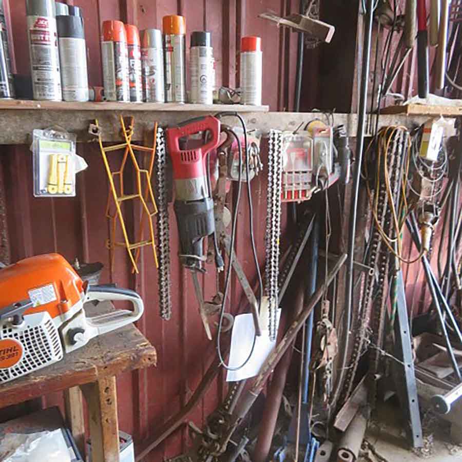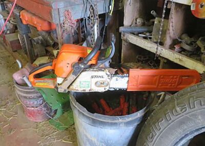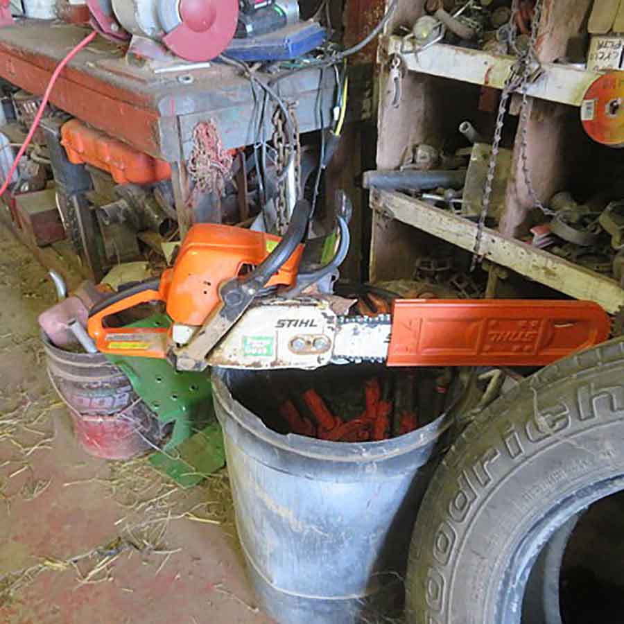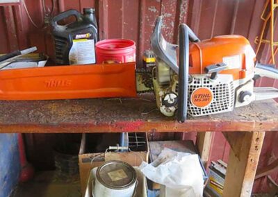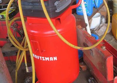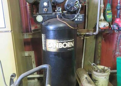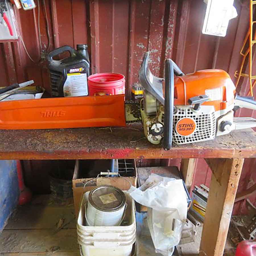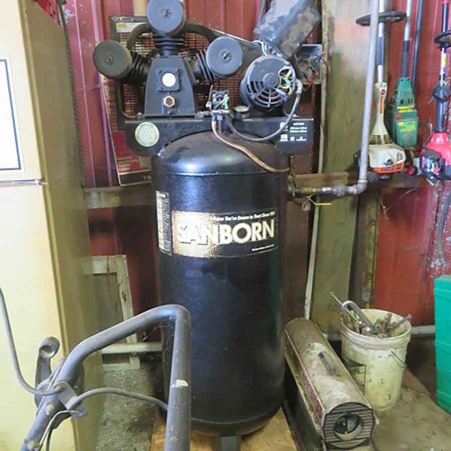 TOOL & SHOP: Coleman Powermate 6250 generator; Generac power washer; 60 gal. Sanborn upright air comp., 155 PSI; Craftsman air comp., upright, 20 gal., 175 PSI, like new; Knipco heater; shop vac; power washer; air hoses; grease guns; log chains; LP white heater; elec. cords; big red tire changer, needs work; Stihl MS 391 chain saw; Milwaukee Sawzall; sand blaster; lg. ass’t of shop tools;